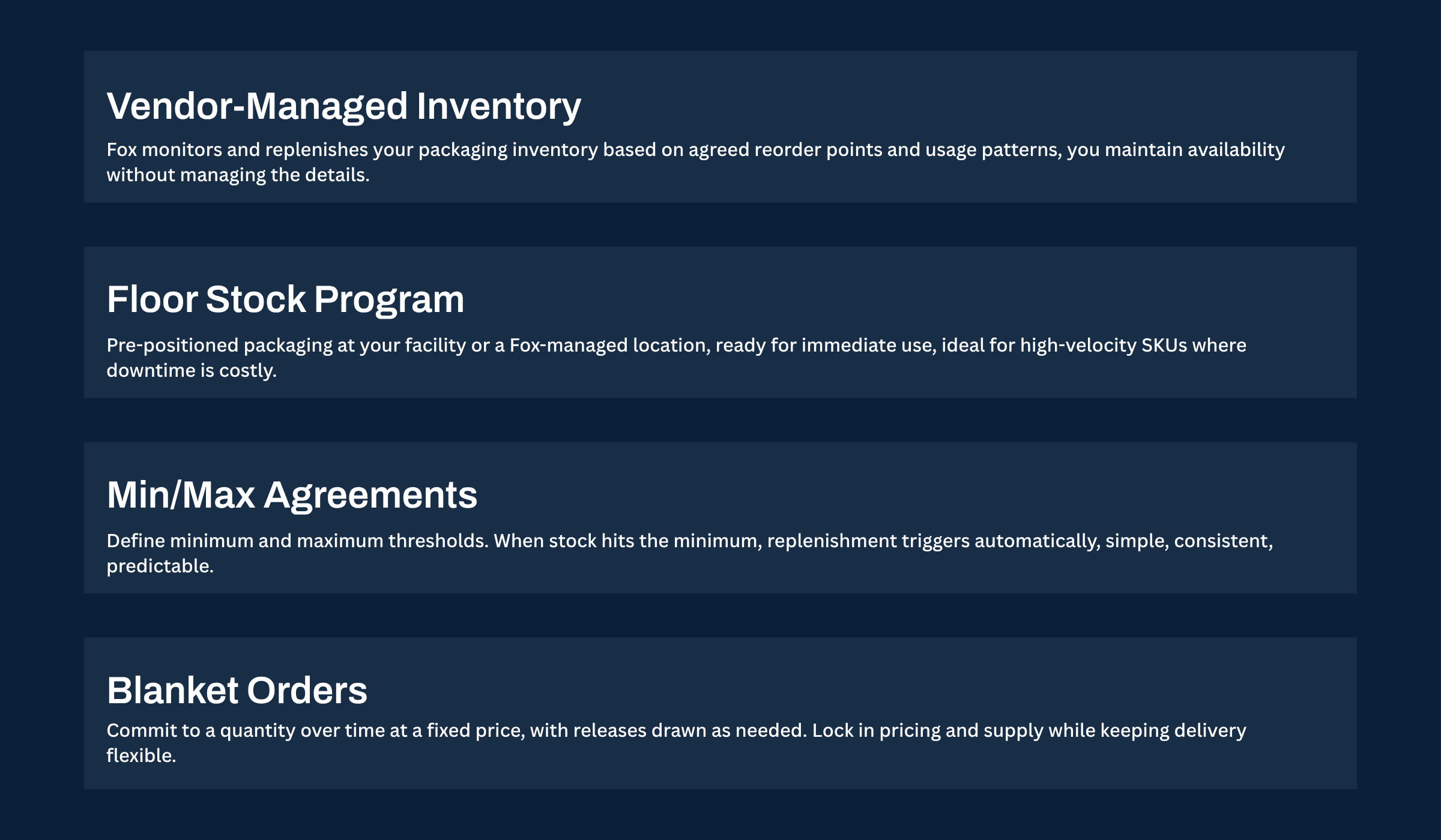 Program requirements vary by structure and SKU complexity. Fox works with a range of customer sizes, the most important factor is consistent, predictable usage that makes advance planning viable. If you're unsure whether your volume qualifies, reach out and we'll take a look.